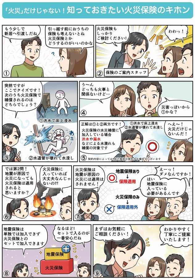 火災保険のキホンというタイトルで、わかりづらい火災保険のポイントをマンガで紹介しています。